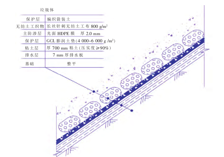 (2)填埋場(chǎng)底部及邊坡防滲結(jié)構(gòu)工程填埋場(chǎng)底部及邊坡防滲采用單層襯砌水平防滲滲透過程。