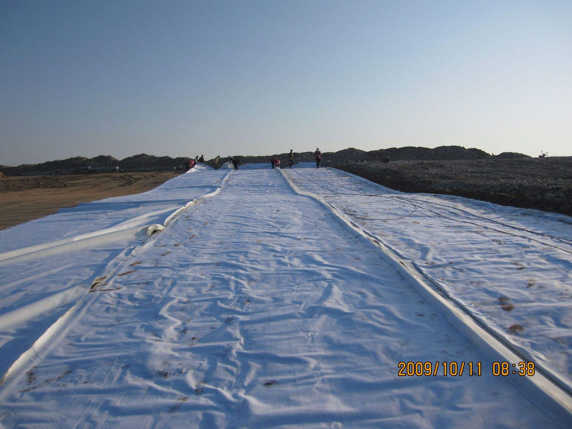 施工中,首先要用料徑較小的砂土或粘土找平基面,然后再鋪設(shè)土工膜。土工膜不要繃得太緊,兩端埋入土體部分呈波紋狀,最后在所鋪的土工膜上用細砂或粘土鋪一層10cm左右過渡層。砌上20-30cm塊石(或砼預(yù)制塊)作防沖保護層。施工時,應(yīng)盡力避免石塊直接砸在土工膜上,最好是邊鋪膜邊進行保護層的施工。復(fù)合土工膜與周邊結(jié)構(gòu)物連接應(yīng)采用膨脹螺栓和鋼板壓條錨固,連接部位要涂刷乳化瀝青(厚2mm)粘接,以防該處發(fā)生滲漏。